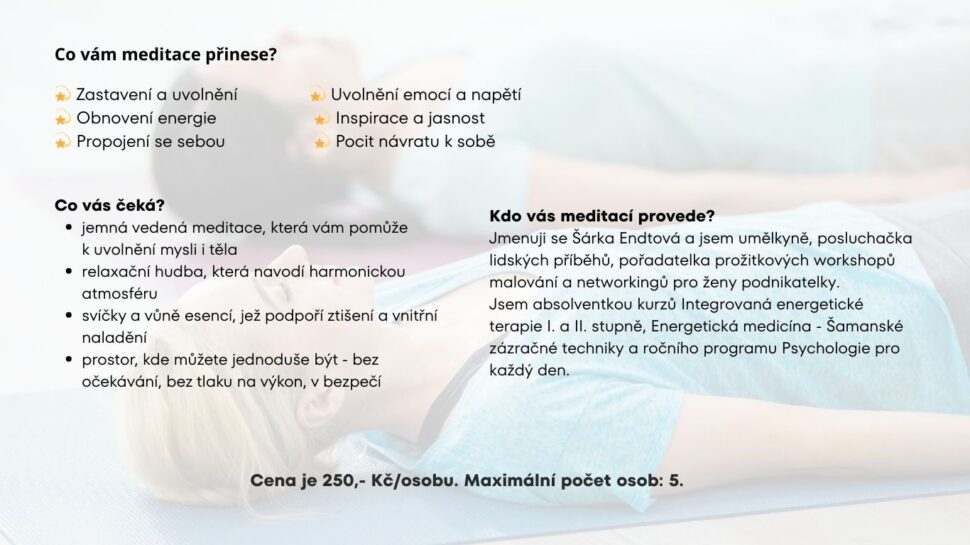Na meditaci u Šárky jsem byla poprvé. Byla krásná, přirozená, uvolňující, řekla bych, že tak půlku jsem prospala. Moc se těším na další.